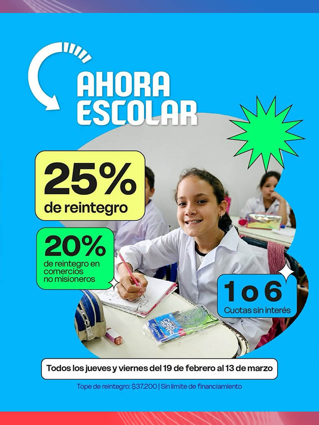 AGENCIA MISIONES.UNO | El Gobierno de Misiones confirmó que desde el 19 de febrero estarán vigentes los programas Ahora Escolar y Ahora Textos, con financiación en cuotas sin interés y reintegros para la compra de indumentaria, calzado y libros en el marco del inicio del ciclo lectivo 2026.